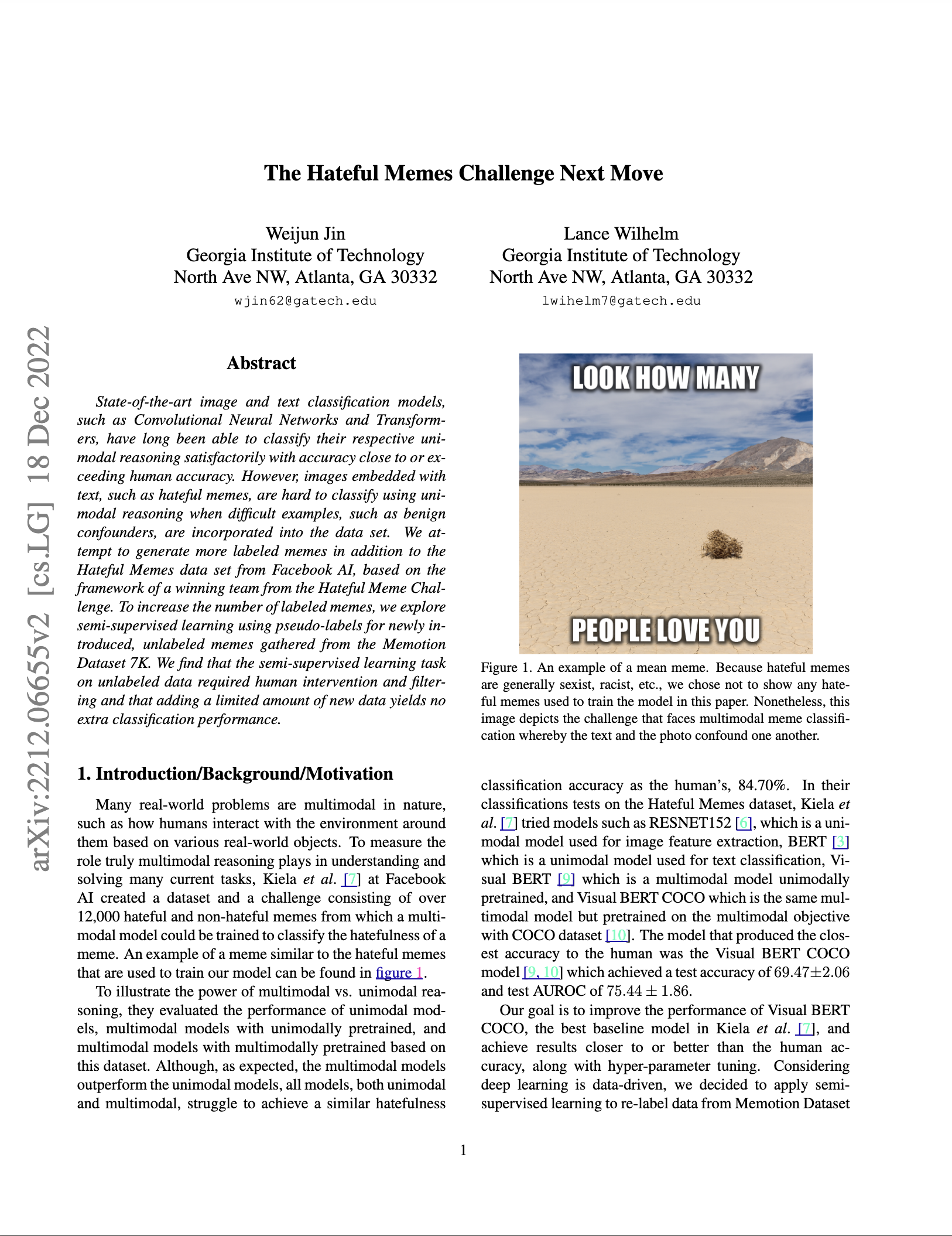 We drew inspiration from the implementation and fine-tuning of the Visual BERT model by Velioglu and Rose. Recognizing the limited size of the Hateful Memes dataset (10,000 images), we sought to incorporate additional training data from larger datasets such as VisualGenome, COCO, and Conceptual Captions. We combined the Hateful Memes dataset with the Memotion 7K dataset, resulting in a total of 19,132 memes.